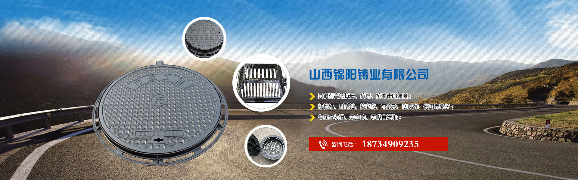 山西錦陽鑄業地處晉、陜、豫交界處臨汾市。臨汾市有豐富的礦產資源和便利的交通,本地有著悠久的鑄造歷史。 本公司專業生產圓井蓋、方形升蓋、套篦、溝蓋板、及防沉降井蓋,目前也在開發智能井蓋的應用。本公司的蓋尺寸和模具全,如有定制產品我公司可快 速出圖紙定做模具試樣。